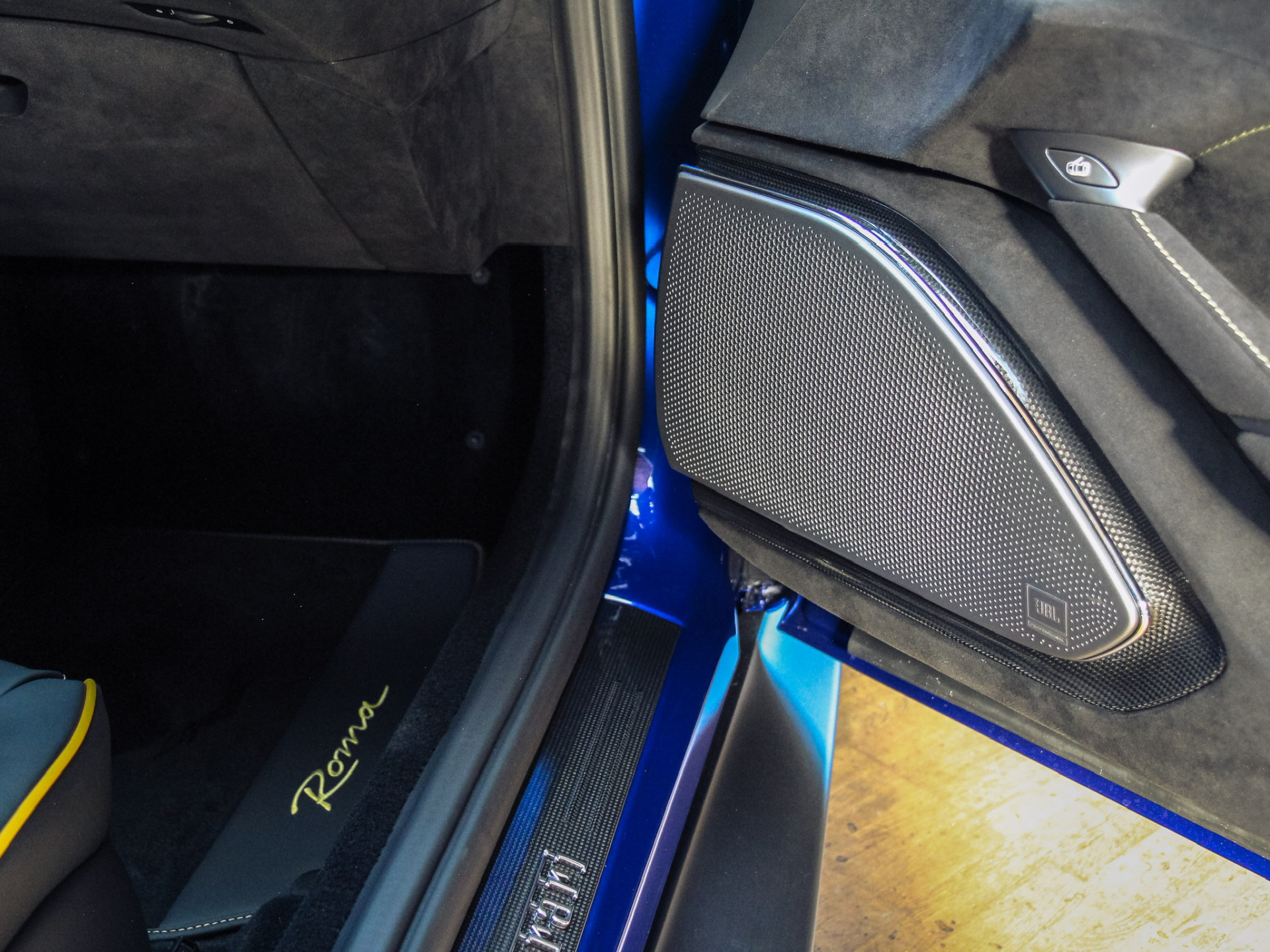 我们很高兴地向您介绍一辆漂亮的法拉利 Roma,车身颜色为蓝色,黄色细节,非常漂亮。如有任何疑问,请随时与我们联系!